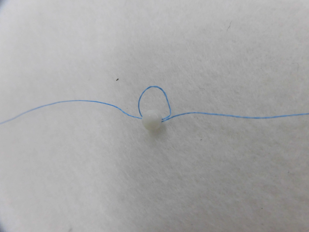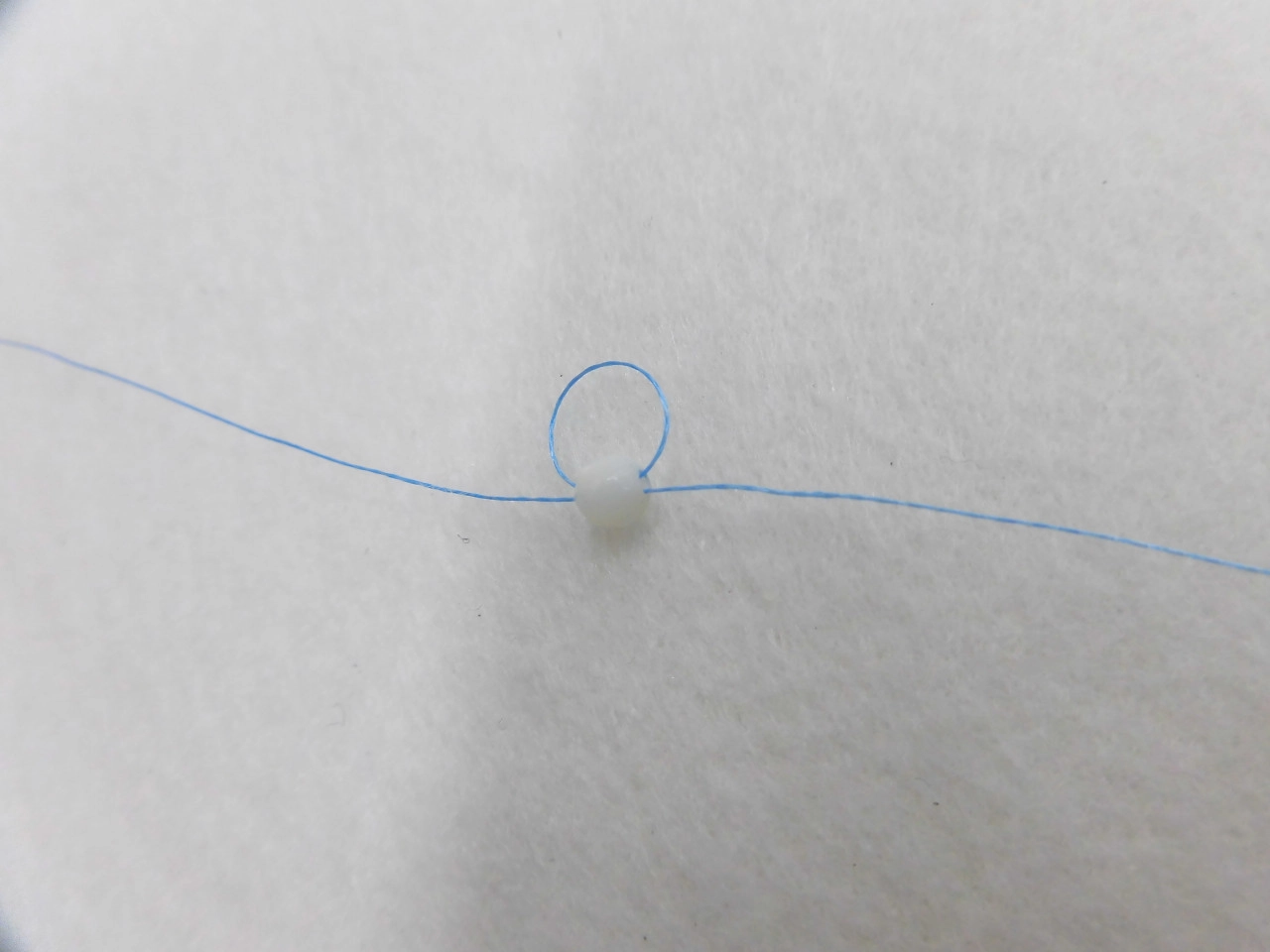 オモリを通して、もう一度ビーズに糸を2回通す。