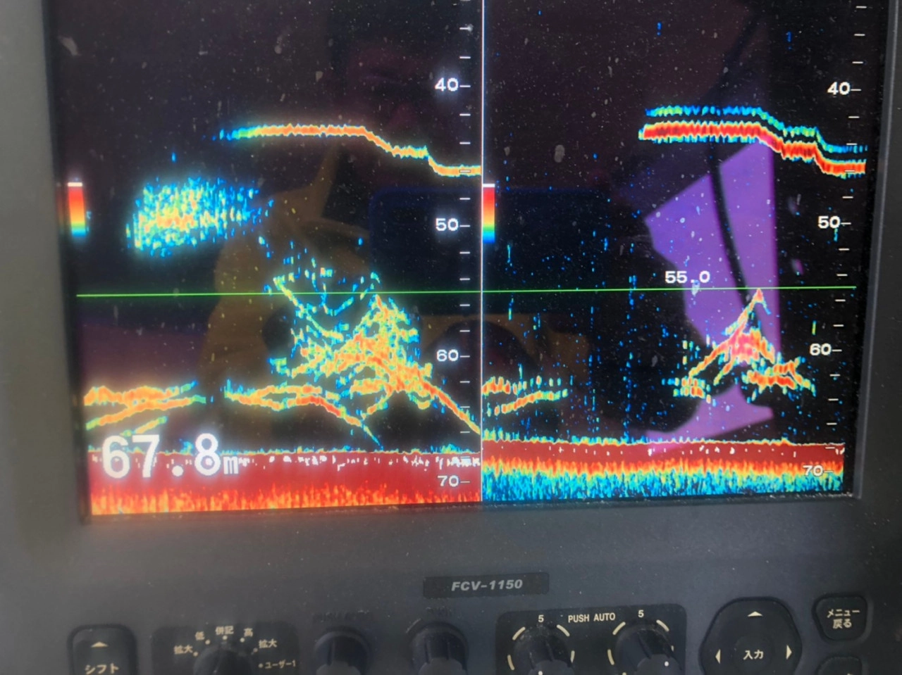 平行になっている線はビシの反応。その下の円状のものはオキアミです。オキアミに魚が突っ込んでいるのが分かりますね。