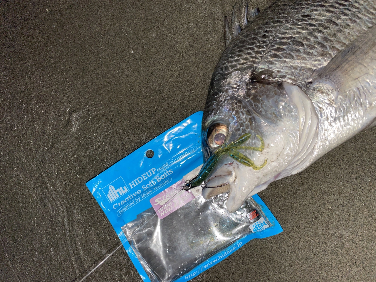 帰り際、車へ戻る道すがらに手前のかけ上がりを釣りながら歩いていると、一気にワームをひったくるバイト!
