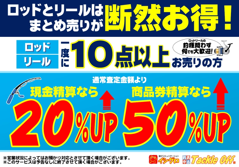 ロッド・リールを期間中にお売り頂くと現金精算10%UP!商品券精算30%UP!!にて買い取りさせて頂きます!