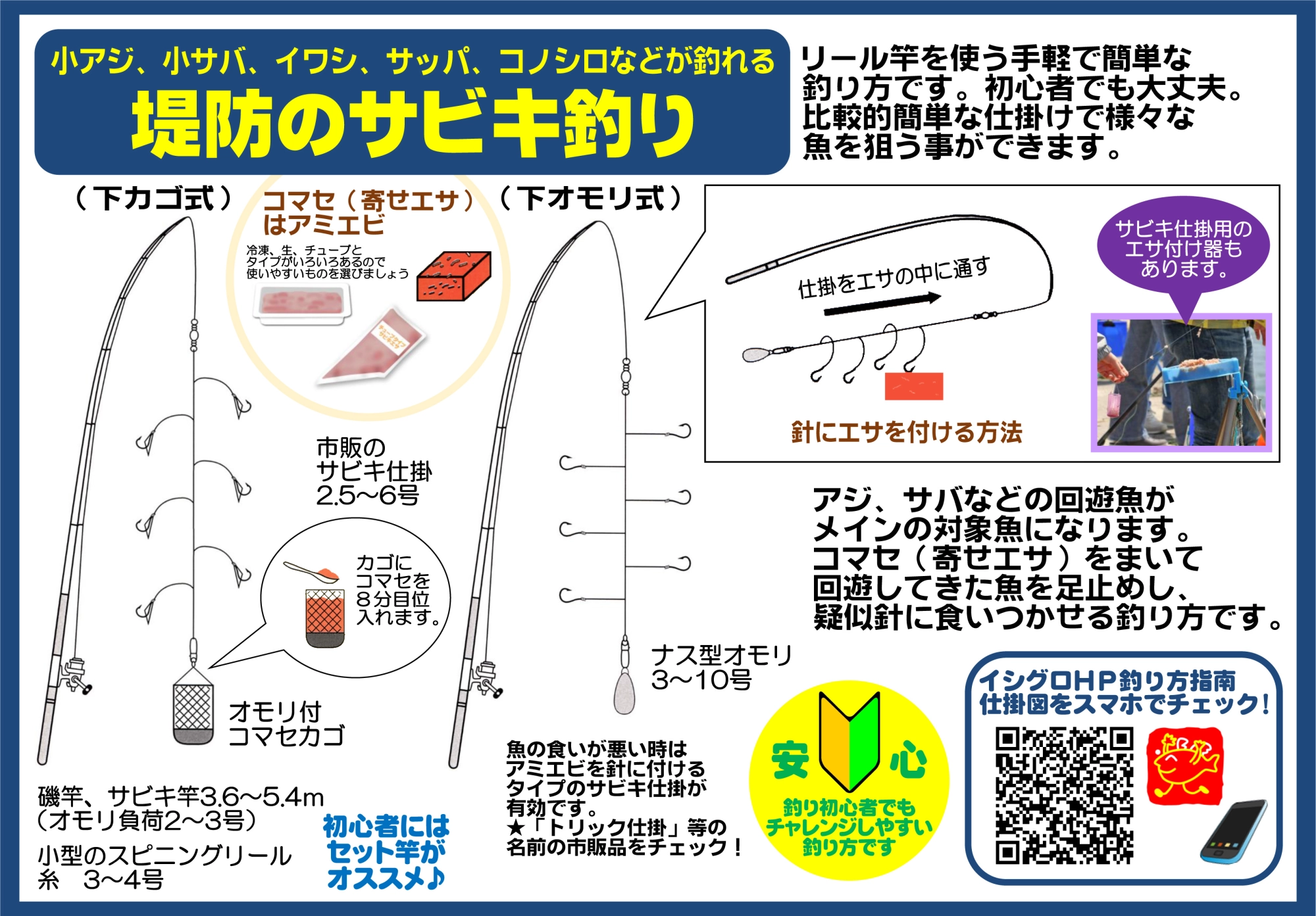 6月以降、釣れるアジ・サバが大きくなり、イワシ・サッパも回遊していれば、針に魚皮・スキンが付いたタイプのサビキ仕掛(またはママカリサビキ仕掛)、その下にコマセカゴを付け、アミエビコマセを入れて狙います。