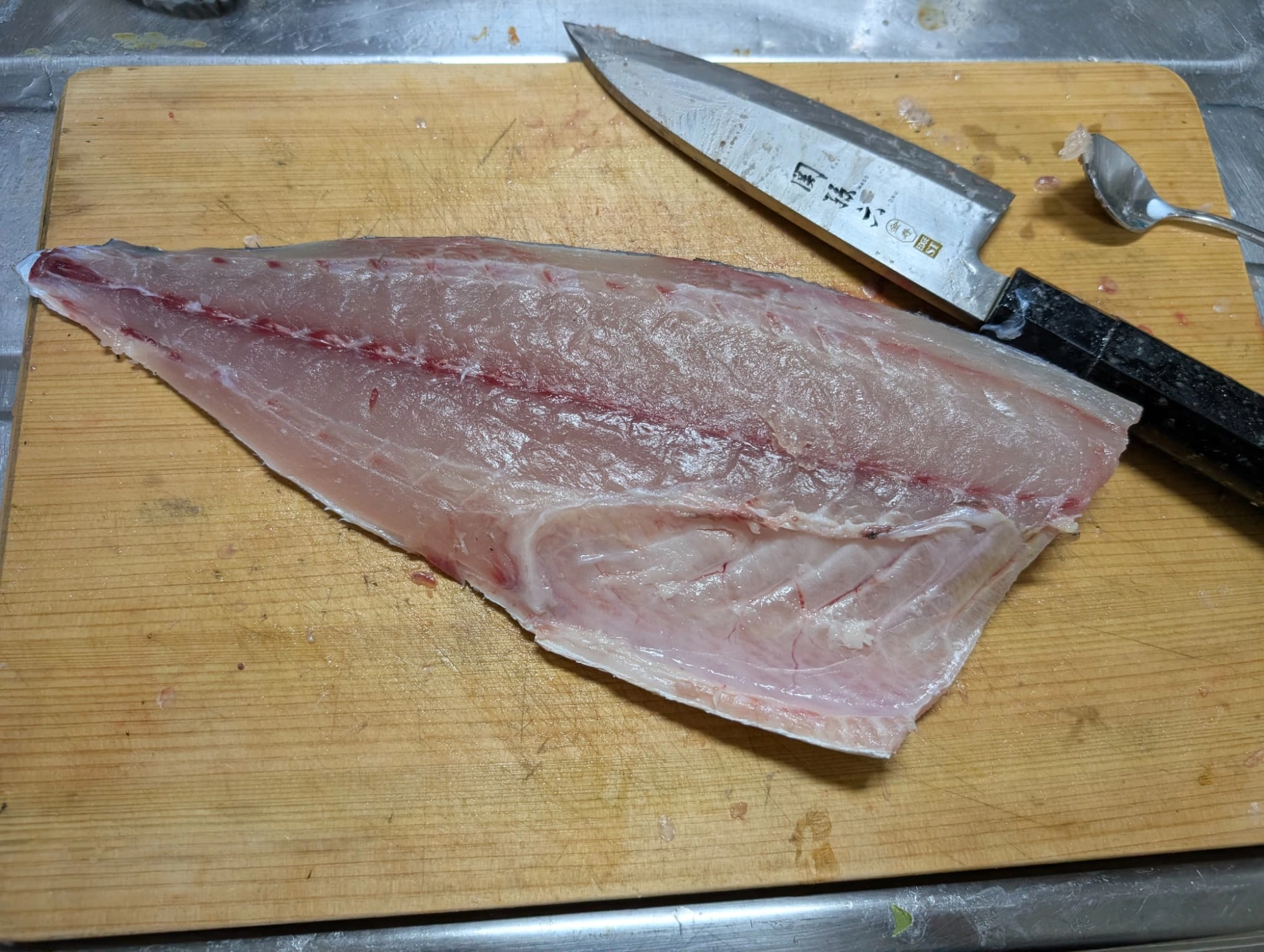 3枚に卸してみると見た目はブリにそっくり!そして脂がノリノリ!手もギトギトになります!