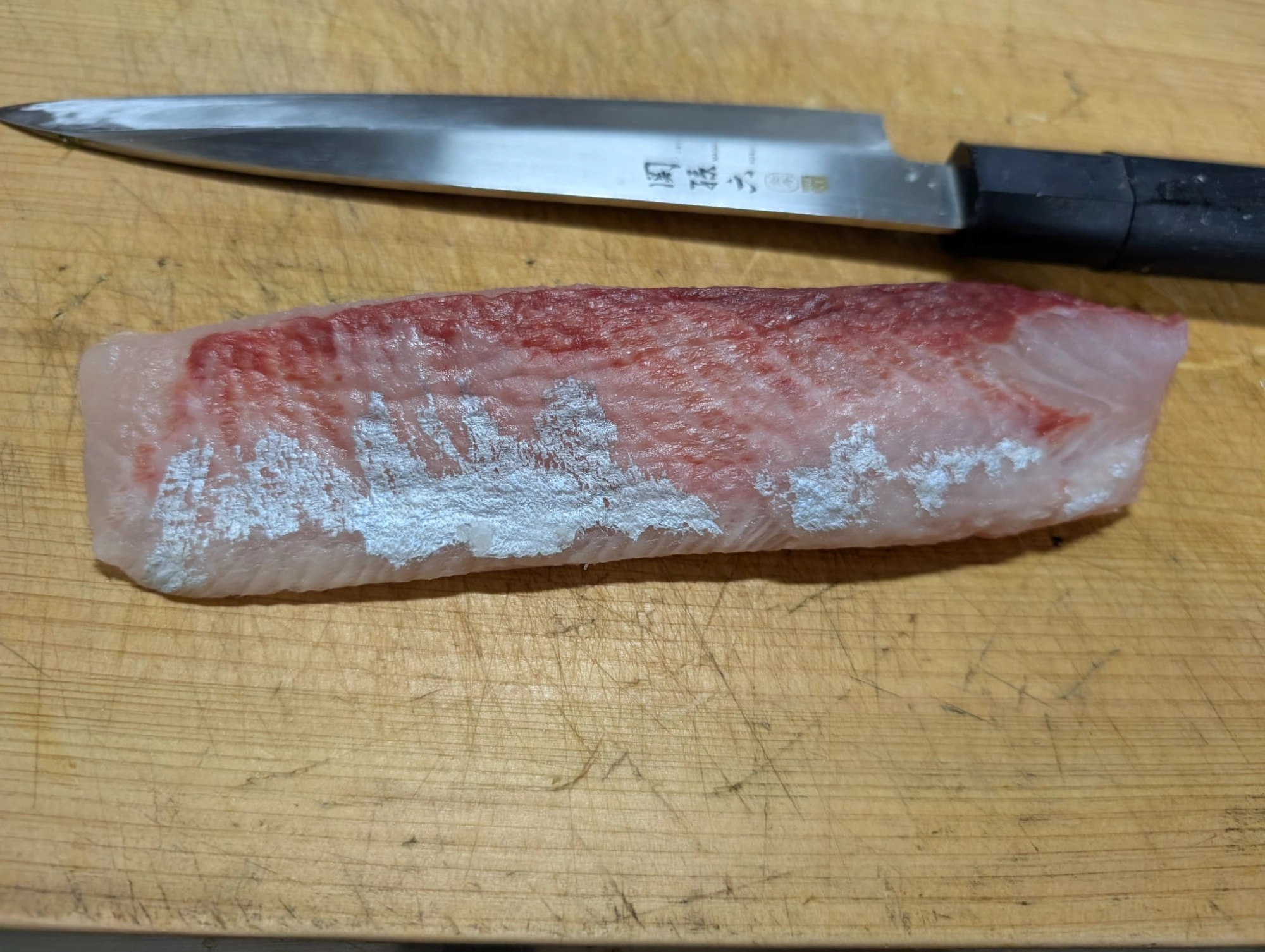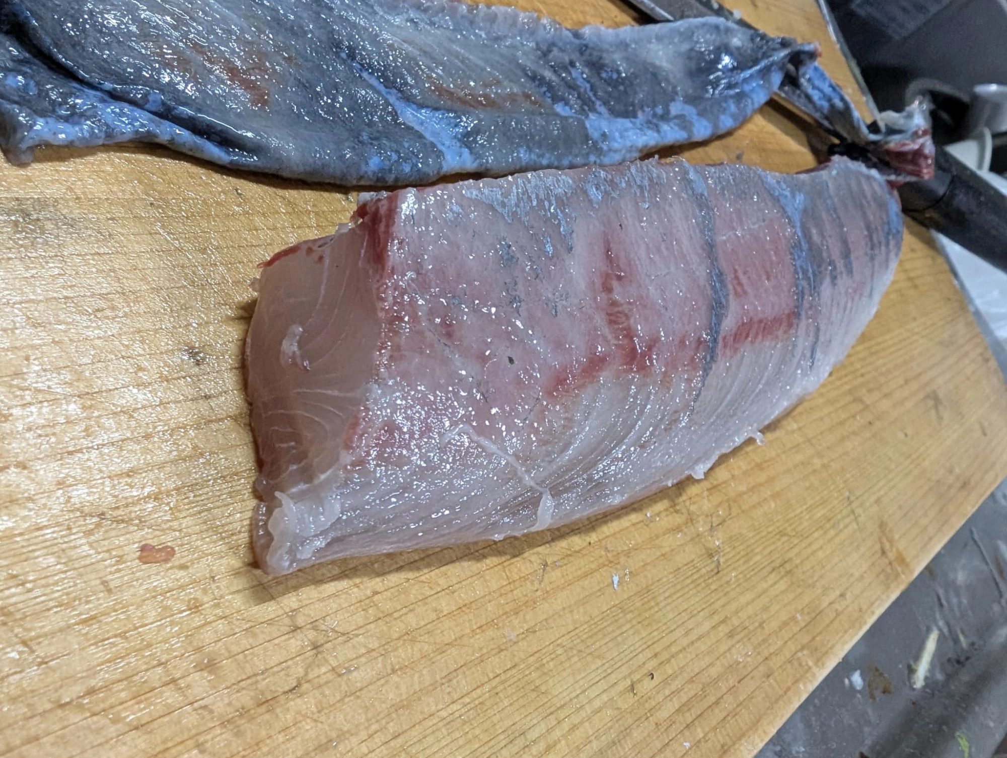 皮を剥いだ身がこちら!皮目にもすごい脂が乗っています!釣ったばかりでまだ身がプリプリなので、キッチンペーパーとラップで包んで1日寝かして…