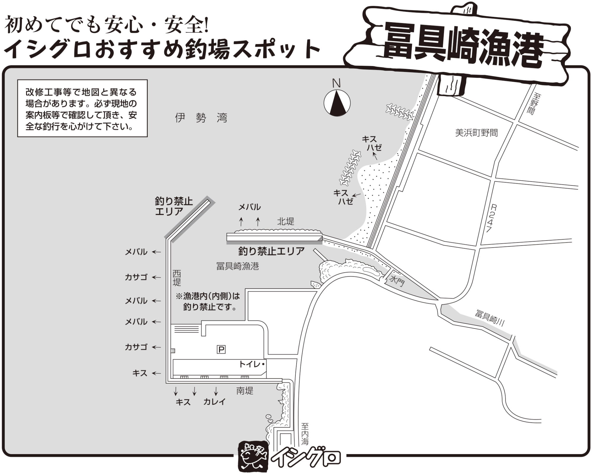 ※冨具崎漁港 港内(内側向き)は、釣り禁止です。