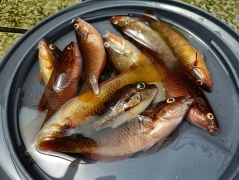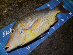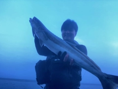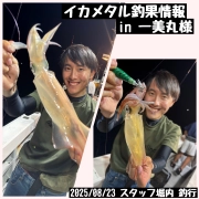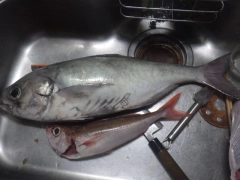 2025.8.23 大潮 石廊崎沖 メダイ  盆休み前にも、イサキを予約していたのですが、台風にて中止!! で、数日前、同じ石廊崎沖でトップ50匹!!最低が20匹・・・期待もあるが、釣れるか不安も少々!! 天気予報は相変わらずの晴れだが、酷暑!!だけが、心配!! で、当日は、好天&酷暑!!風が西から吹いているので、どうなるかと思っていたら、船長から「今日も石廊崎沖へ向かう!!」とアナウンス!!! 出港すると、大きなうねりは無く、西に向かうので向かい風が心地よく爽やか!!! (勿論、船が止まれば、ねっとりとした風がまとわりつく) 5時集合との事だったが、岸壁に到着したのが5時だったので、道具積み込み等で20分後に出港!! 1時間ほど走り到着!! 周りを見回すと、潮目の中、300m先には流れがあり、船の周辺には波が無い! 終始、同じ所を攻めていた、タナは150~155m。 大潮なので、流れが速い!!と思ったので、正直あまり期待していなかった!! で、結果いうと、竿頭20匹だが、3kg前後なので、あまりうれしくない!! 6時30分頃開始から10時近くまで、ほぼ入れ食い!!   時合を過ぎたら途端に食いが悪くなる!! 食いが悪くなっても、反応はあるので誰かが釣れたら、コマセを振り、ポツリ、ポツリと拾い釣りになった!! 10時半を過ぎると、反応はあるが中々釣れない、周りを見ると湖の様にまっ平!! それでも、右前のオジサン(常連月一乗船の強者)の竿が曲がるので、こっちも大きく竿を煽る!! (で、釣れたり、釣れなかったり) また10時過ぎから、船の周りに青ザメが居つきだす!!全長5m位の青い物体が、ユラ~~~と泳ぎまくり!! (青が鮮明で、キレイ!!!) 私は、横盗りされなかったが、掬いあげ直後に寄って来た!!!間一髪セーフ!!! もし、横盗りされたら、素早く手を離さないとケガをするし、最悪、竿を折られるので、注意が必要!! って、言っても一瞬だからねぇ~~~~USJばりのアトラクションだった! 今回、外道はほぼ釣れず、唯一写真のハチビキが、一匹のみ!! お隣さんが、同サイズを5~6匹は釣っていた!!最初にコマセを振ったのかな?