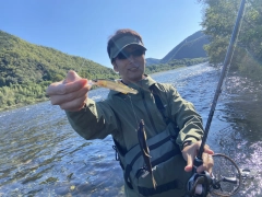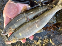 金曜日に降った雨でコーヒー色土曜日は柳色日曜日は澄み元に戻るのがはやい多分ダムで水をとめてるのかな雨の中でしたので濁りの時に良いピンク系澄みの時の黒系にしました。土曜日が暖かく日曜日はかなり冷え込んでいたので渋かったです跳ねはあったのですが鮎同士がぶつかって跳ねてるだけでした。