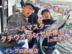 同じ釣魚の記事 イシグロ静岡中吉田店 1,048 view 焼津港タチウオ釣れました! タッチポンとキビナゴノーシンカーでの釣果。キビナゴ使い切るほどアタリ多かったですが、細タチ多くエサを取られてばかりでした。隣のウキ釣り師は10本以上釣っていたので魚はたくさんいます! 釣行日 2023/09/13 釣行時間 23:00~01:30 釣場 大井川・焼津周辺 ポイント 釣魚 タチウオ 釣り方 その他 釣果 タチウオ3匹 サイズ タチウオ最大指3本幅 イシグロ磐田店 2,870 view 天竜川沖のタチウオ爆釣中!福田港の喜勝丸様にて! でかいタチウオ釣るなら今がチャンス!仕掛けはツリノの「夜光ケイムラMIXワイヤー3/0」を使用。おもりは150号です。 釣行日 2023/09/13 釣行時間 09:00~14:30 釣場 沖・オフショア ポイント 天竜川沖 釣魚 タチウオ 釣り方 船釣り 釣果 タチウオ17匹 サイズ タチウオ指4本~5本 イシグロ岡崎大樹寺店 5,202 view 【タチウオ乱舞‼】豊浜釣り桟橋にてタチウオ・アジが好調‼ 日没からタチウオは高活性‼エサはキビナゴで釣りました。サビキ釣りはカゴサビキ、トリックサビキどちらでも釣れましたよ♪ 釣行日 2023/09/13 釣行時間 16:00~22:00 釣場 豊浜釣り桟橋 ポイント 釣魚 アジ・タチウオ 釣り方 その他 釣果 アジ多数、タチウオ2人で22匹 サイズ アジ~15cm、タチウオ指2.5~指3本 イシグロ三河安城店 392 view シマノ 富所先生タチウオテンヤ講習会 サーベルマスター60号 チャートグローがアタリカラーでした 釣行日 2023/09/13 釣行時間 07:00~12:00 釣場 沖・オフショア ポイント 釣魚 タチウオ 釣り方 船釣り 釣果 タチウオ~20本 サイズ タチウオ~5本 イシグロ中川かの里店 1,231 view イカ先生のタチウオテンヤ研修に行ってきました! ドラゴンも出現して楽しい研修でした!テンヤは60号を使用しました。鰯エサのほかコノシロ等でも釣れていましたよ!ドラゴンにはやっぱり大判鰯ですネ 釣行日 2023/09/13 釣行時間 05:30~12:30 釣場 沖・オフショア ポイント 伊良湖沖 釣魚 タチウオ 釣り方 テンヤ 釣果 タチウオ10匹 サイズ タチウオ100cmくらい イシグロ西春店 437 view ひと狩りいこうぜ!!ドラゴンハンティング!忠栄丸さんでテンヤタチウオ【ゴリ野の実釣日記】 ドラゴン連発!?シマノ サーベルマスター船テンヤで爆釣しました! 釣行日 2023/09/12 釣行時間 08:00~12:00 釣場 その他 ポイント 釣魚 タチウオ 釣り方 テンヤ 釣果 タチウオたくさん サイズ タチウオMAX指7本120cm イシグロ沼津店 1,157 view 爆釣タチウオジギング!! ベイトが小さい為、シルエットの小さいダイワTGベイトの60g~80gが良く釣れました!! 釣行日 2023/09/12 釣行時間 20:00~01:00 釣場 沖・オフショア ポイント 由比港出船 博友丸 釣魚 タチウオ 釣り方 ジギング 釣果 タチウオ67匹 サイズ タチウオ最大指5本 イシグロ鳴海店 793 view イカ先生に現在好調の【タチウオテンヤ】を学んできました! ◎イシグロ鳴海店◎ テンヤは最低3種類、エサも最低3パックは持って行きましょう! 釣行日 2023/09/12 釣行時間 05:40~13:00 釣場 沖・オフショア ポイント 忠栄丸様 釣魚 タチウオ 釣り方 テンヤ 釣果 タチウオ船中100匹以上 サイズ タチウオ~指7本 イシグロ西尾店 430 view [ドラゴン連発!]サーベルマスター研修会でドラゴン連発!in忠栄丸[イシグロ西尾店] 片名港「忠栄丸」さまでシマノ様合同の研修会に行ってきました!講師はなんと富所さん!ドラゴン連発でタチウオテンヤまだまだ好調です♪ 釣行日 2023/09/12 釣行時間 06:30~12:30 釣場 沖・オフショア ポイント 伊勢湾 釣魚 タチウオ 釣り方 テンヤ 釣果 タチウオ多数 サイズ タチウオ~指7本 イシグロ岡崎若松店 693 view 【爆釣】富所さんに聞く!!伊勢湾太刀魚テンヤ!!【イシグロ岡崎若松店】 タチウオテンヤのコツやタックルセレクト方法などを富所さんに教えて頂きました。 釣行日 2023/09/12 釣行時間 06:00~12:00 釣場 沖・オフショア ポイント 釣魚 タチウオ 釣り方 テンヤ 釣果 タチウオ船中100匹以上 サイズ タチウオ~指7 イシグロ焼津店 1,111 view 港内タチウオ回遊中!ワームにヒット! ヒットルアーはグラスミノーL。アタリは他にも数回ありました!ウキ釣りでも釣れていましたよ! 釣行日 2023/09/12 釣行時間 23:00~23:30 釣場 大井川・焼津周辺 ポイント 釣魚 タチウオ 釣り方 その他 釣果 タチウオ1匹 サイズ タチウオ指2.5本幅 イシグロ津高茶屋店 1,554 view タチウオテンヤが楽しすぎた! ~イカ先生?いや、タチ先生参上!~ 餌がセットしやすいシマノ サーベルマスター船テンヤ60号がオススメ! 餌のイワシは1人4パックは欲しいところ! 釣行日 2023/09/12 釣行時間 05:00~12:00 釣場 渥美半島・伊良湖岬周辺 ポイント 釣魚 タチウオ 釣り方 サーベルテンヤ 釣果 タチウオ20本以上 サイズ タチウオ~指5本 イシグロ半田店 405 view 【タチウオテンヤ in 忠栄丸】大嵐の中のドラゴン狩り!! ○イシグロ半田店○ シマノ「サーベルマスター船テンヤ60g」にテンヤ用イワシを付けるとタチウオ炸裂!!定番のグロー、ゼブラパープルカラーに加え、雨天時にはゼブラグローチャートもオススメ。 釣行日 2023/09/12 釣行時間 06:30~12:30 釣場 沖・オフ