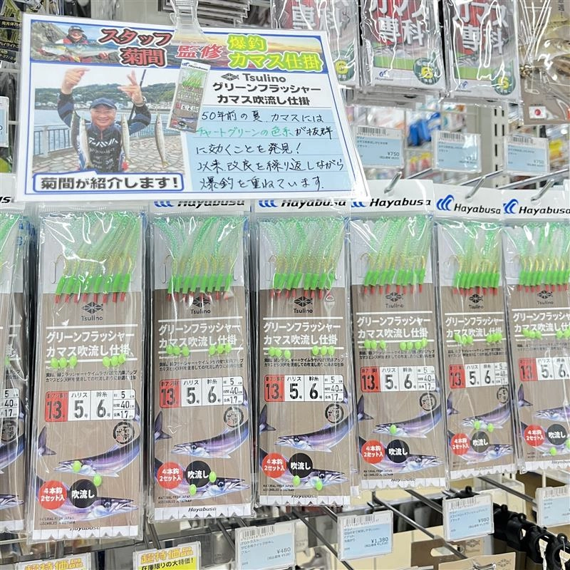 ↑【Tsulino グリーンフラッシャーカマス吹流し仕掛け】店頭にて好評販売中です。
