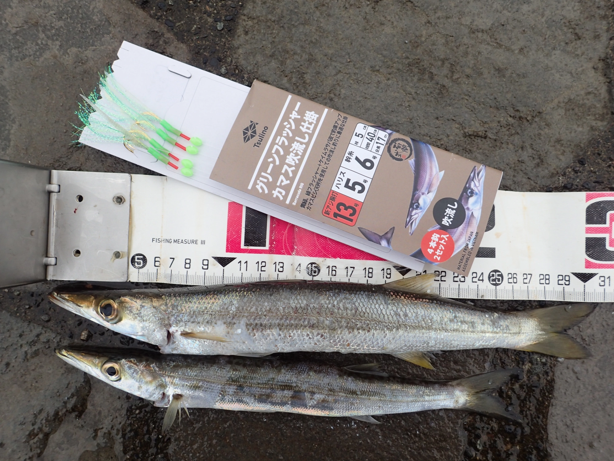 いるか浜堤防にて投げサビキ仕掛でカマスが釣れました。サビキはTsulino グリーンフラッシャーカマス吹流し仕掛を使用しました。