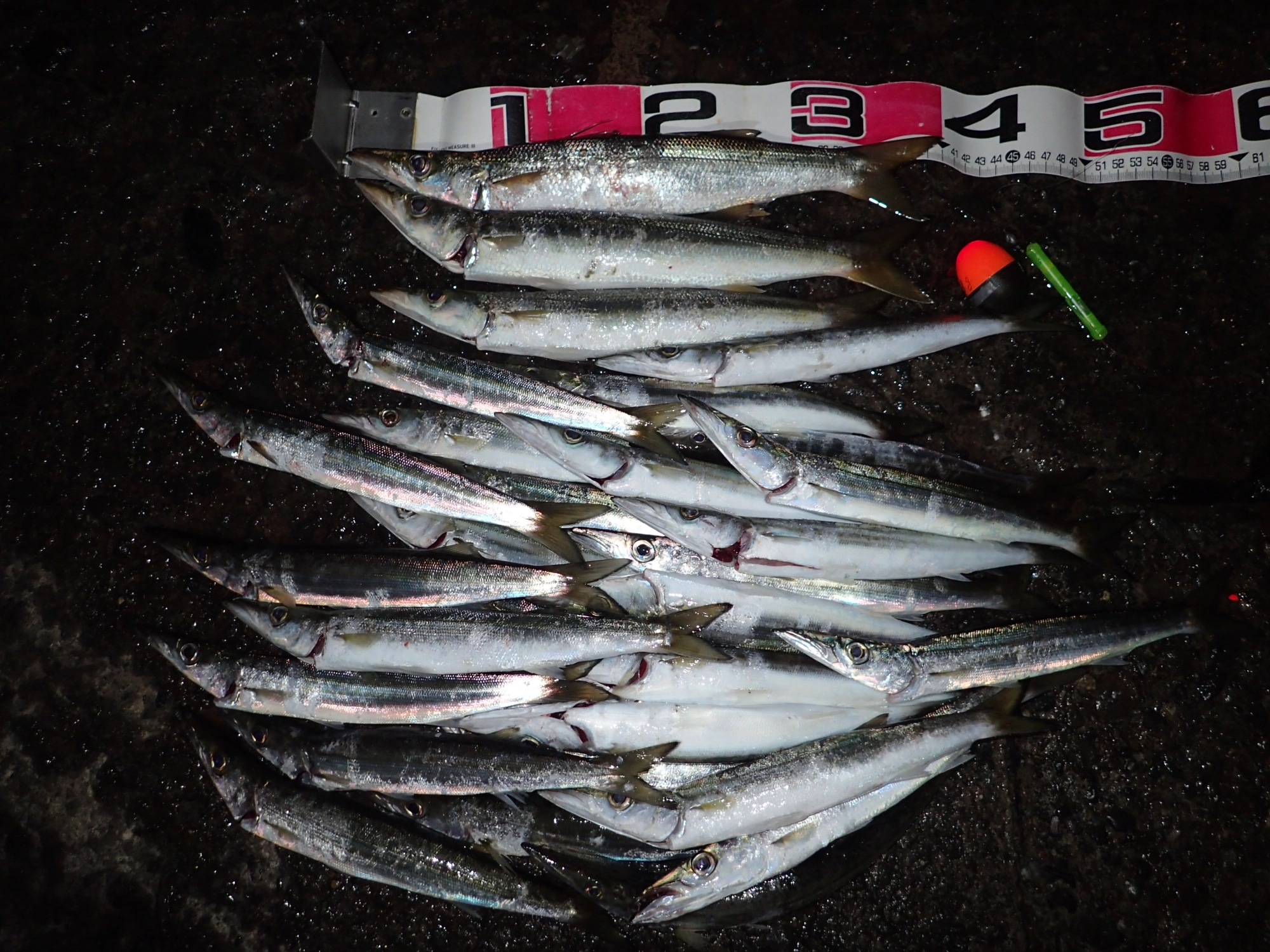 このエサ釣りで40cmクラスの大型アアカカマス(アブラカマス)3匹とヤマトカマス(ミズカマス)20匹をキャッチし、風向きが変わった20:00に納竿しました。