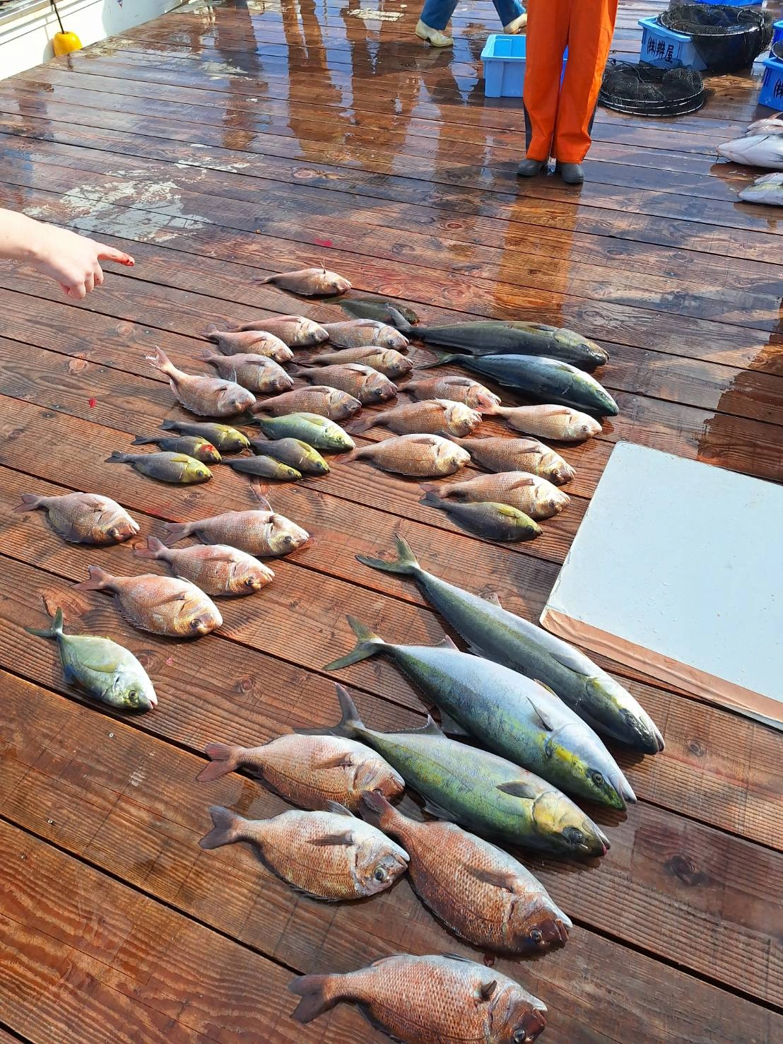 終わってみればスタッフ平松は青物こそシマアジだけですが、さすがのつ抜け!大樹寺店鈴木もワラサとマダイで8匹とまずまず!野澤はワラサ2本、ヒラマサと青物は良かったのですがマダイは4匹とちょっと悔しい7本、お客様も僕の鮎師匠こそちょっと厳しかった(笑)ですがみなさんデカカンパチやヒラメ、シマアジなど釣って楽しめました!!