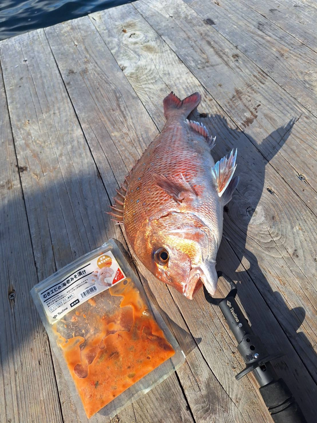 後半の渋い時間にゴールドイソメを3cmほどにカットしたものを4~5本房掛けにして表層から徐々に落としていくとィいきなり引っ手繰るあたりでマダイが釣れちゃいました!やっぱりゴールドイソメは絶対欠かせないエサです!!!