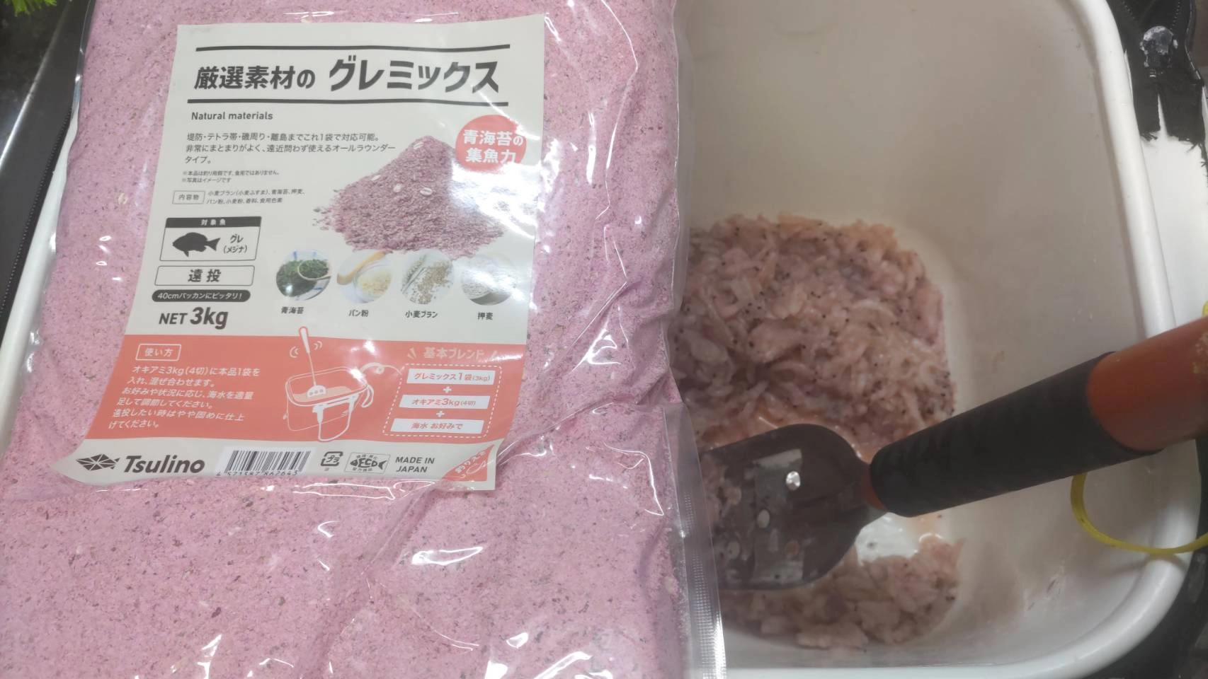 今回のコマセ配合ですが、オキアミ6kgにまずはTsulino厳選素材のグレミックス。