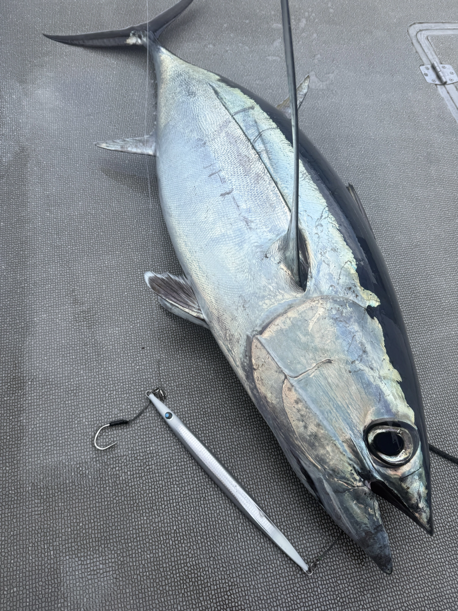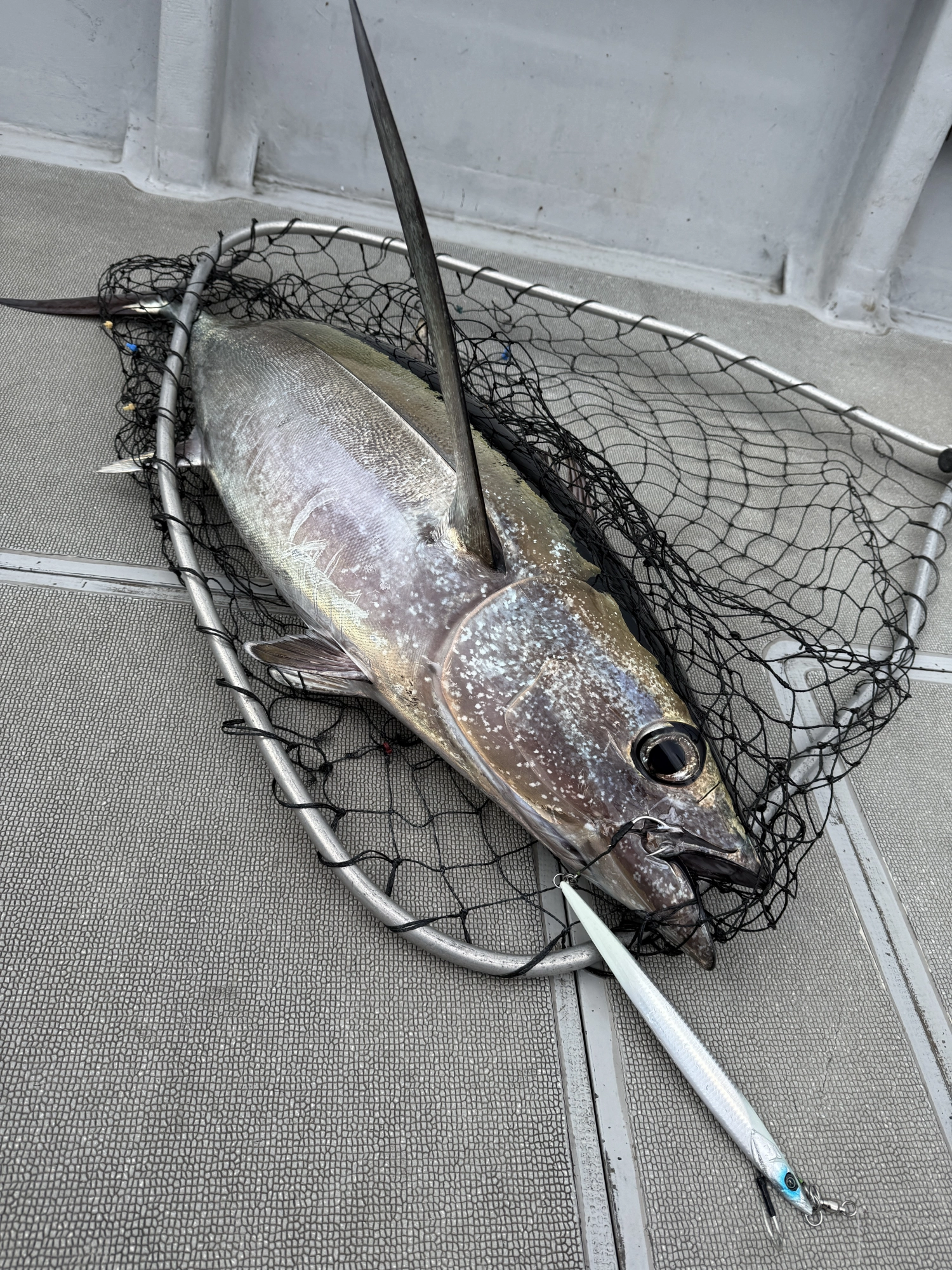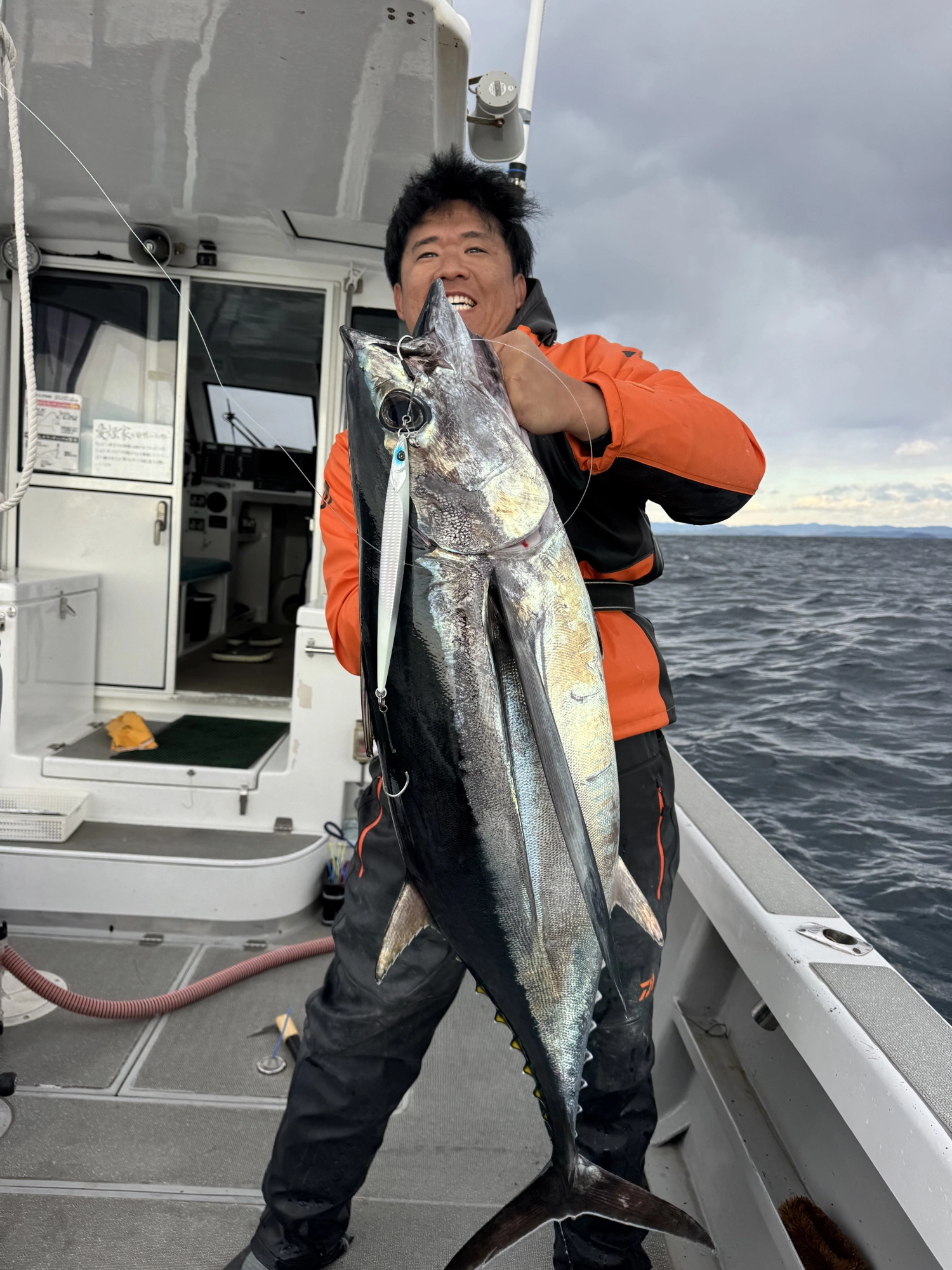 今度は17kgのトンボ、ジグはウロコジグオリジナル 450g シルバーダブルエンドグロー。この日は雲が多く、影ができる時間が長かったため、グロー系が強い日でした。