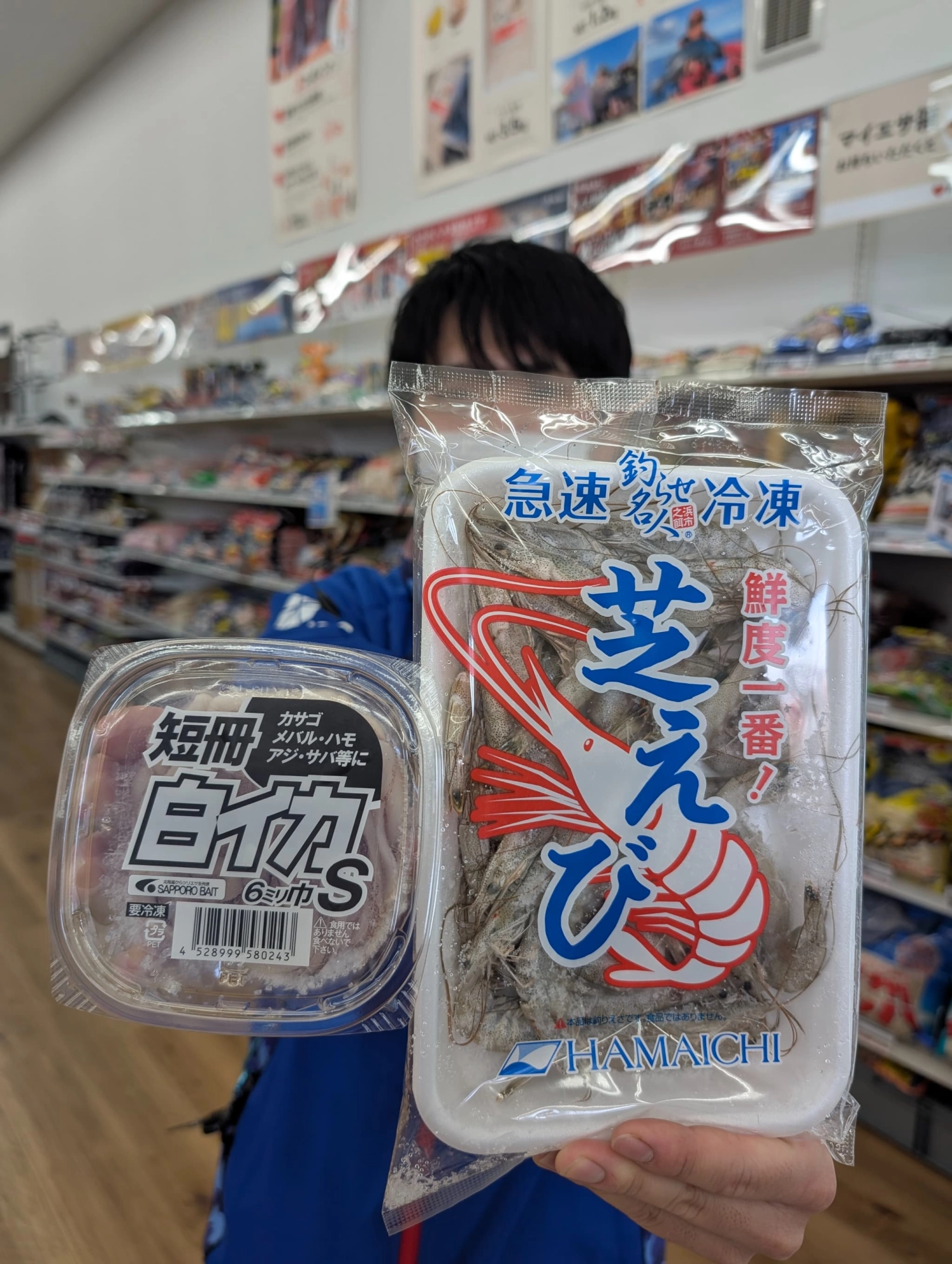 エサはイカの短冊と冷凍芝エビ!アピール力重視で、中でも大きいものを付けます!