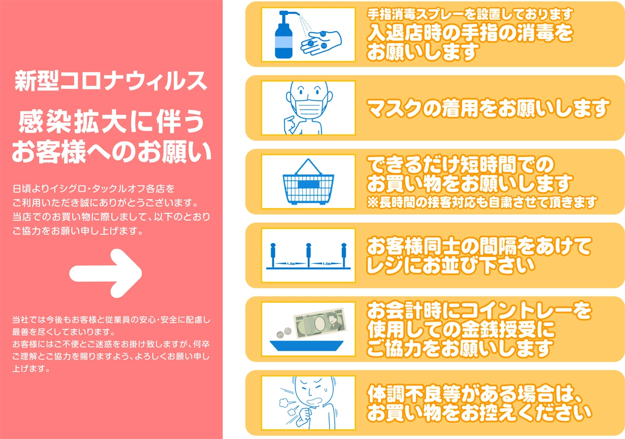 ※ご来店の際は「マスク着用」「手指消毒」をお願い申し上げます。ご入店時の「体温測定」にご協力下さい。37.5度以上の発熱がある場合はご入店をご遠慮頂きます。お並びの際は、前者との距離を十分に取り、警備員の指示に従い、入場して頂きますようお願い致します。ご理解とご協力のほど、お願い申し上げます。