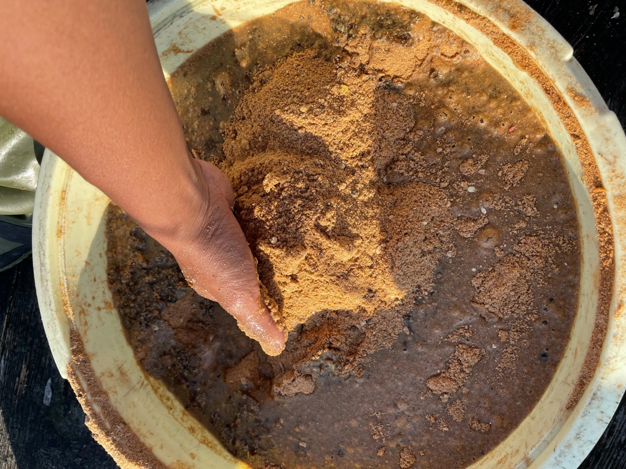 A『パワーダンゴチヌ』1袋+『激重ペレット』1/2袋をムラなく桶で混ぜ合わせる!