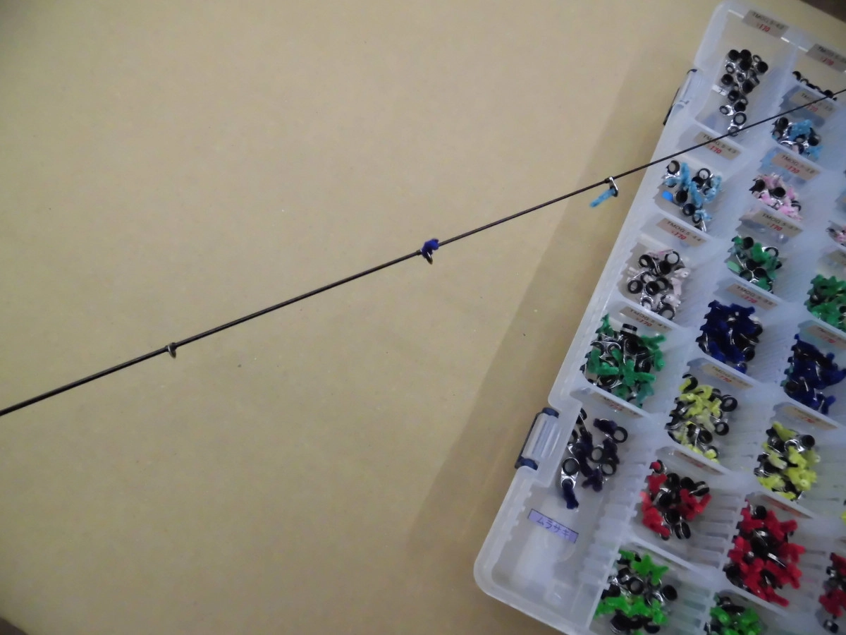 この竿の使い方は、手前のガイド3個ぐらいでスパライルにガイドを固定、#1は下向きガイドになるよう伸ばして使用します。