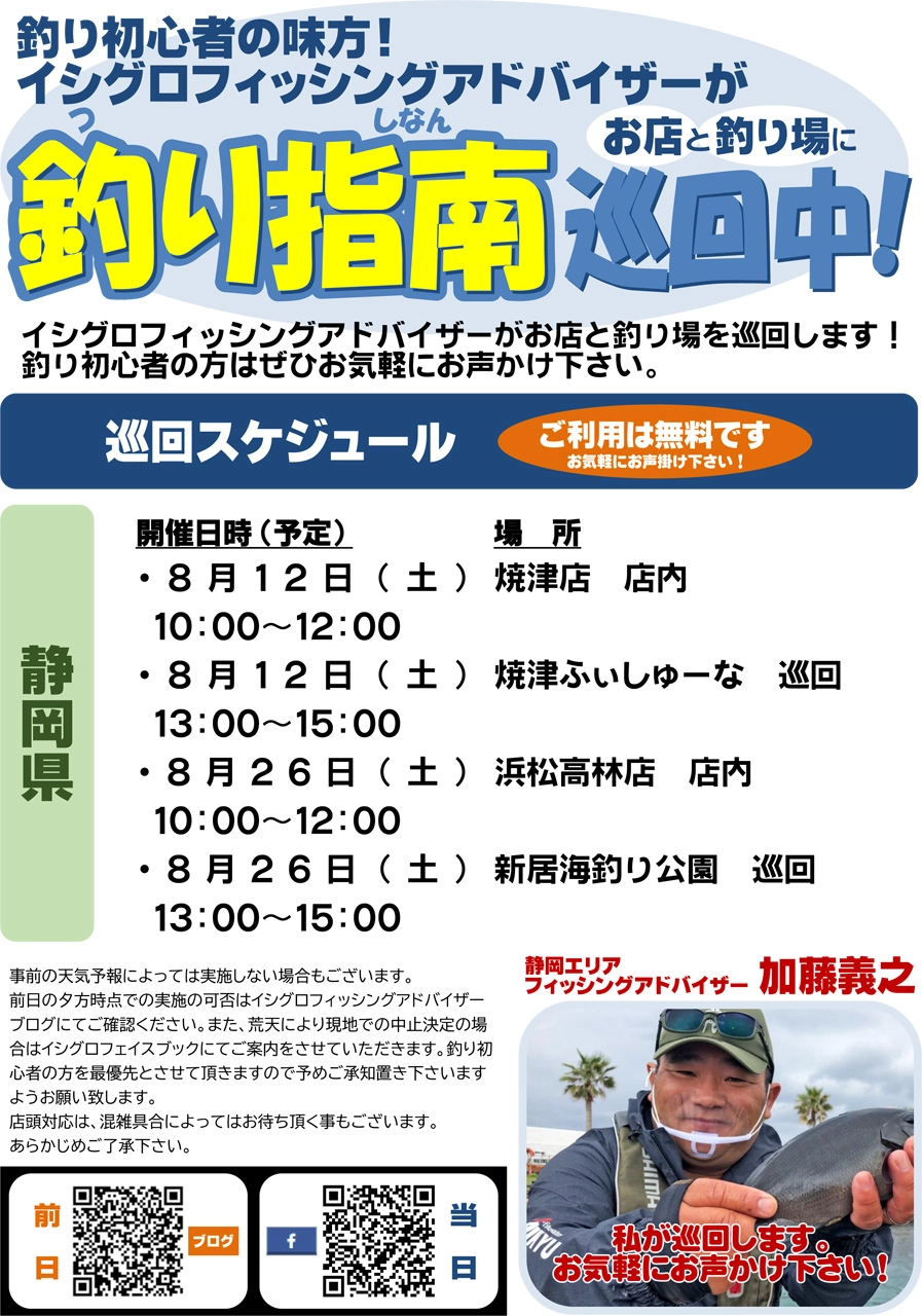 8月12日(土) 静岡県中部 親水広場ふぃしゅーな、8月26日 静岡県西部 浜名湖新居海釣り公園 にてフィッシングアドバイザー 釣り指南巡回を開催します。