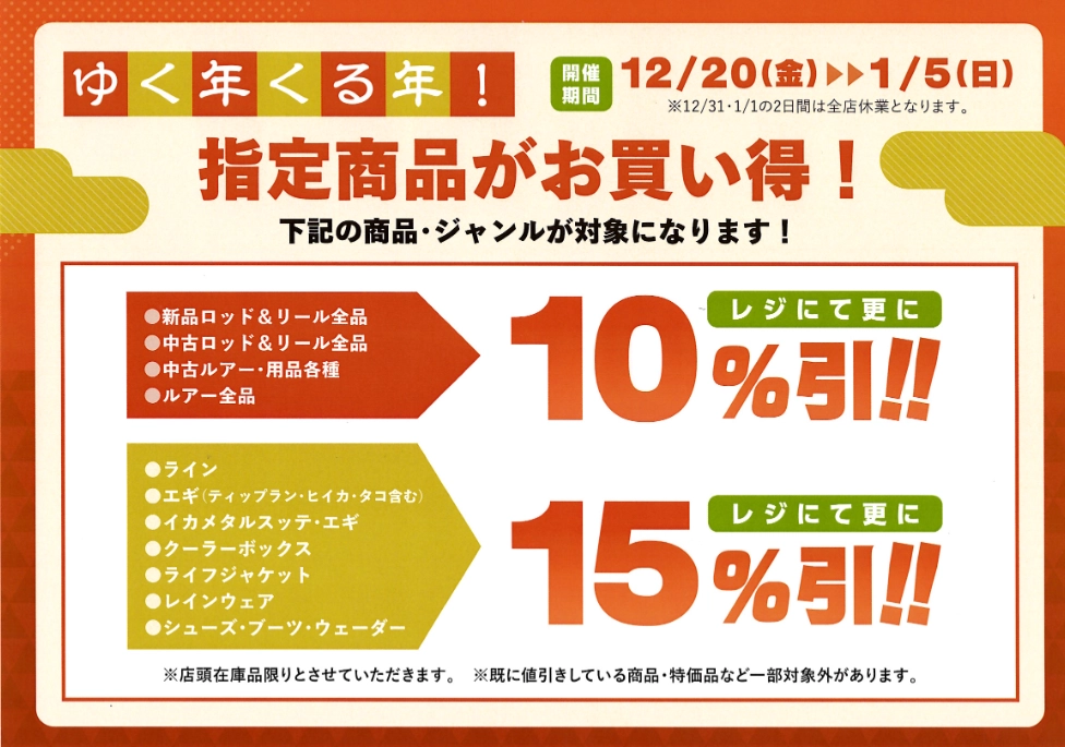 ①新品/中古の竿・リールが全て10%引き