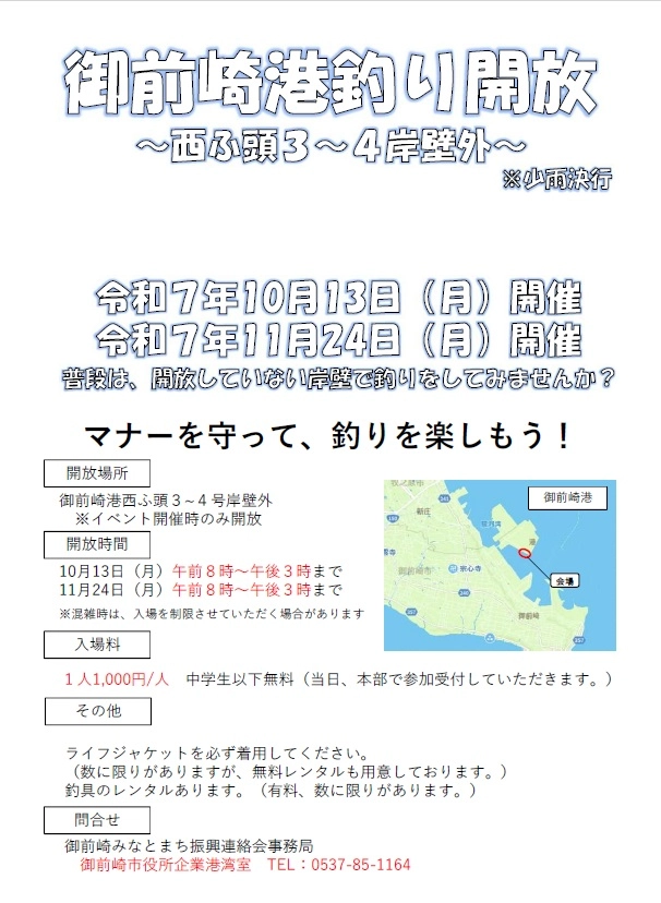 11月24日(祝)御前崎港西ふ頭 3~4岸壁にて釣り場解放が行われます。普段は釣り人の立ち入りが規制されている場所を1日限定で釣り場として開放するこちらのイベント。今シーズンは2度目の開催。前回の開催では鯵の回遊がありアジング、サビキ釣り共に釣果あり。時期的にそろそろ青物の回遊も期待できそうです♪