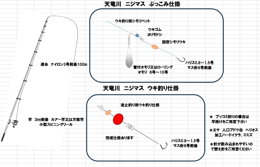 11月22日(土)天竜川浜北大橋右岸にて【天竜川ニジマス釣り場】が開催されます。AM9時頃より250㌔のニジマス放流が予定されています。18歳以下の方は無料にて釣りを楽しむ事が出来ます。ルアー釣り、毛ばり釣りに加え手軽に楽しめるウキ釣りもおススメです。