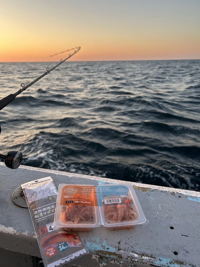 日ごとにアタリ餌が異なる為 実績の高い ホタルイカ、大粒のオキアミ を中心に近年甘鯛狙いのマストアイテムになってきている太青イソメを使います。